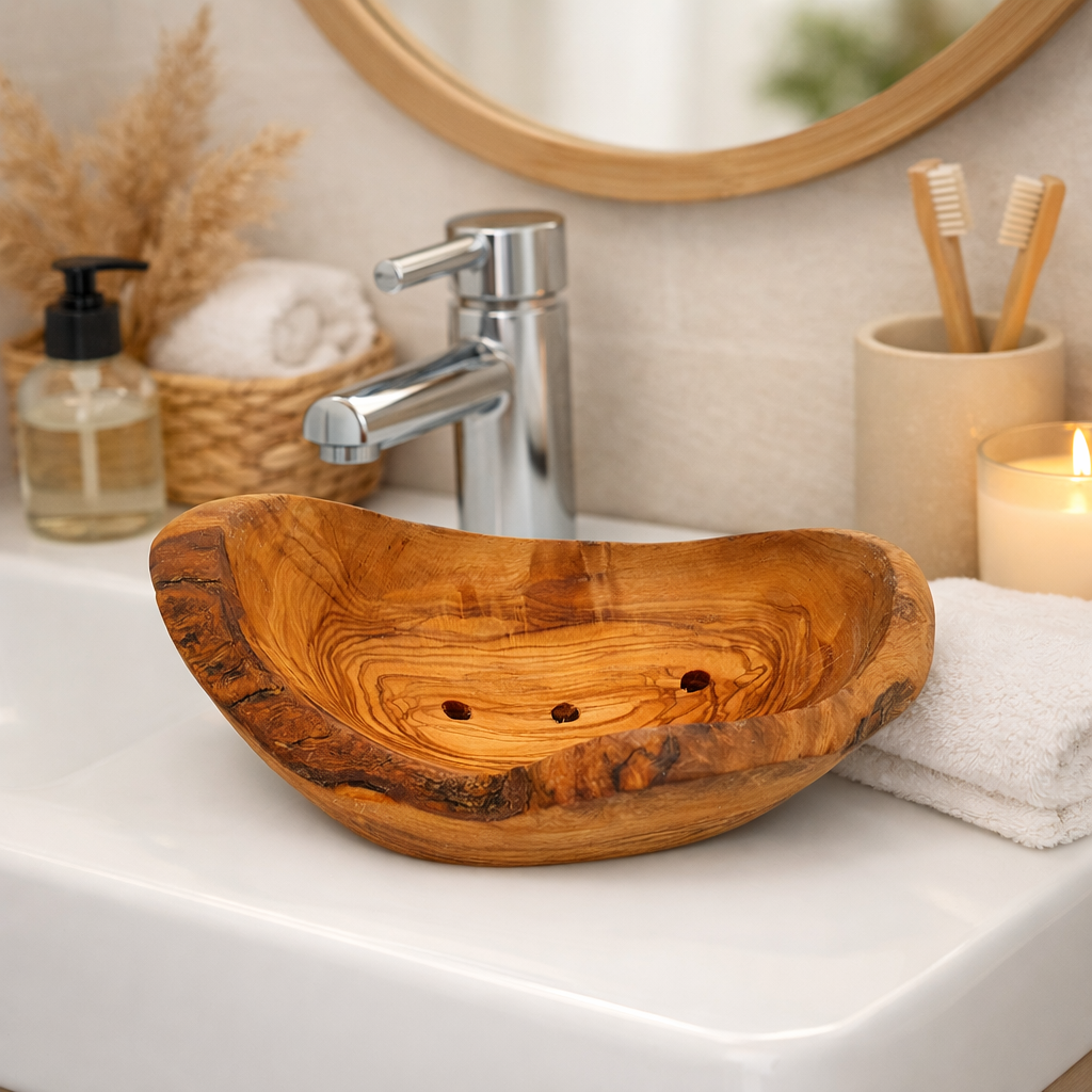 Diese in Handarbeit gefertigten Olivenholz Seifenschalen verschönern jedes Bad durch die charakteristische Maserung des Olivenholzes und die rustikale Verarbeitung. Sie sind mit Olivenöl eingeölt und sehr leicht zu reinigen – ab und zu Seifenreste auswaschen, trocknen lassen und wieder mit etwas Olivenöl einreiben.
