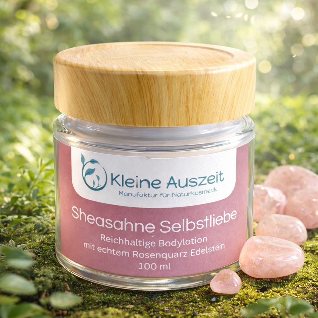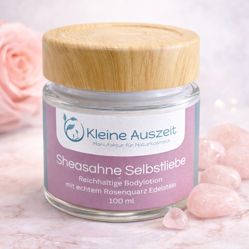 Im Glas liegt ein Rosenquarz von 2–4 cm Größe. Seit jeher gilt er als Symbol für Liebe und Herzöffnung. Viele Menschen schätzen ihn als Begleiter für Selbstannahme und Mitgefühl. Während er in deiner Sheasahne ruht, darf seine symbolische Energie die Pflege umgeben. Mit jeder Anwendung verteilst du diese bewusste Intention sanft auf deiner Haut – als Zeichen dafür, dass Selbstfürsorge kein Luxus ist, sondern deine Basis.
